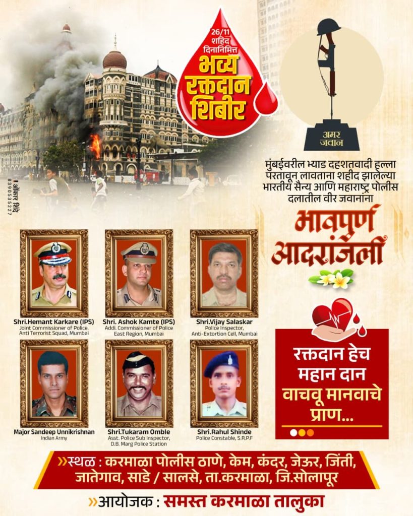 दिनांक 26 नोव्हेंबर 2008 रोजी मुंबईवर झालेल्या भ्याड दहशतवादी हल्ल्यात भारतीय सैन्यदल व पोलीस दलातील अनेक वीर जवानांनी देशासाठी सर्वोच्च बलिदान दिले. या शूरवीरांच्या अद्वितीय शौर्याची आणि शहादतीची स्मृती जपण्यासाठी दिनांक 26 नोव्हेंबर 2025 रोजी करमाळा तालुक्यात भव्य रक्तदान शिबिराचे आयोजन करण्यात आले आहे.